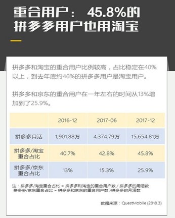 從用戶分布來(lái)看,據(jù)企鵝智酷發(fā)布了《拼多多用戶研究報(bào)告》,拼多多的一線城市用戶,實(shí)際上只比淘寶低了2個(gè)百分點(diǎn);2017年底,有46%的拼多多用戶同時(shí)也是淘寶用戶,是所有電商平臺(tái)中最高的;拼多多和京東的重合用戶,一年內(nèi)增長(zhǎng)了一倍。