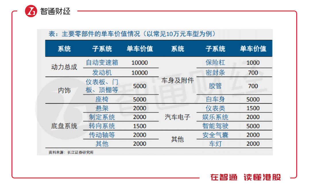 先看燃油車,按照長(zhǎng)江證券的研究,以10萬元車型為例,各系統(tǒng)價(jià)值合計(jì)5.58萬元,動(dòng)力總成占了35.8%,內(nèi)飾及汽車電子占33%,底盤占17%,車身及附件占13.3%。