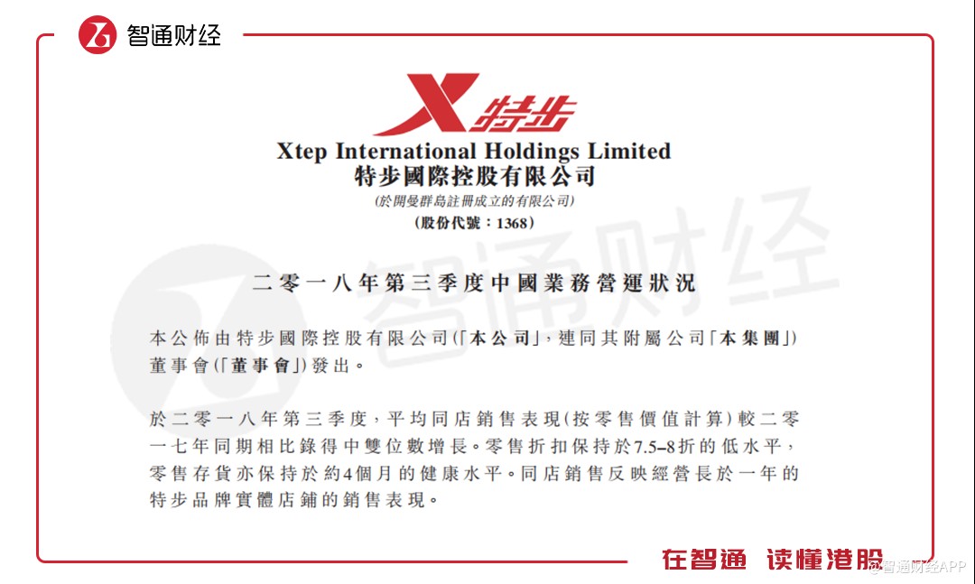智通財(cái)經(jīng)APP獲悉,10月8日公告稱,公司于2018年第三季度,平均同店銷售表現(xiàn)(按零售價(jià)值計(jì)算)較2017年同期相比實(shí)現(xiàn)中雙位數(shù)增長(zhǎng)。零售折扣保持于7.5–8折的低水平,零售存貨也保持于約4個(gè)月的健康水平。