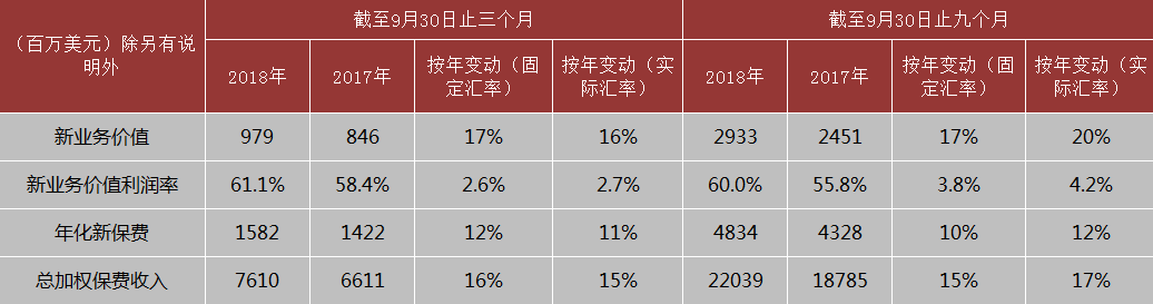 11月9日,友邦保險控股有限公司(1299)公布截至2018年9月30日止第三財季業(yè)績顯示,報告期內,按固定匯率計算,公司新業(yè)務價值增長17%至9.79億美元,年化新保費上升12%至15.82億美元,新業(yè)務價值利潤率增加2.6個百分點至61.1%,總加權保費收入上升16%至76.10億美元。