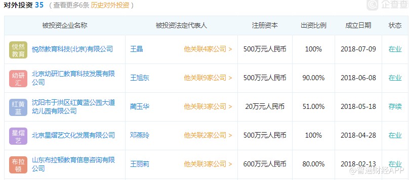 不過,在內(nèi)地業(yè)務(wù)上,該公司今后的發(fā)展方向或也會出現(xiàn)一些變化,教育衍生品或?qū)⑹窃摴就顿Y方向,以該公司2018年投資的標的來說,根據(jù)企查查的數(shù)據(jù),該公司投資成立的大部分是教育相關(guān)的服務(wù)。以下為企查查搜到的紅黃藍2018年投資成立的項目: