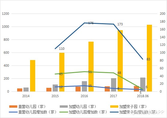 2018年上半年,紅黃藍共有90家直營幼兒園,216家加盟幼兒園以及1029家加盟親子園,加盟一直是該公司擴張發(fā)展的主力,但2018年突然剎車,上半年加盟幼兒園增加僅6家,而加盟親子園也折戟超過了一半。