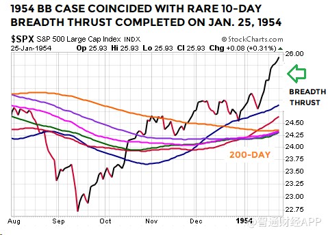 1954年1月25日時的廣量沖力指標(biāo)如下圖所示,在4個交易日前,布林通道月線圖出現(xiàn)前述形態(tài)。與2019年相似的是,當(dāng)時的點位接近200日均線的水平: