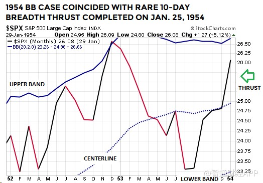 1954年1月最后一個交易日結(jié)束后,當(dāng)時的布林通道月線圖與2019年1月末時的極為相似: