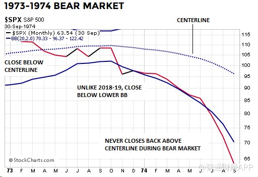 下圖是1973-74年時的情形,標(biāo)普500指數(shù)在整個熊市期間都無法重新回到布林通道中軌之上。與2019年(即到目前為止)不同的是,1973年11月標(biāo)普500指數(shù)收于下軌以下: