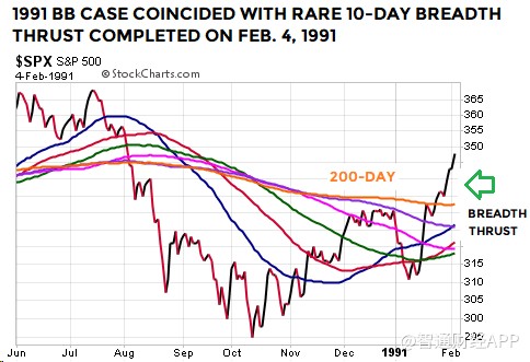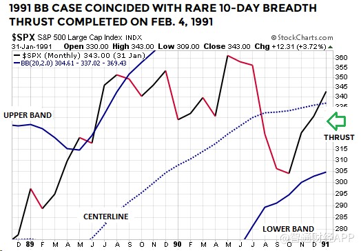 上述布林通道技術(shù)形態(tài)屬較為罕見的類型。值得注意的是,1954年和1991年時的另一技術(shù)指標(biāo),廣量沖力指標(biāo),基本上與2019年1月21日出現(xiàn)的廣量沖力指標(biāo)形態(tài)類似。因此,在1954年、1991年和2019年,標(biāo)普500指數(shù)走出了布林通道及廣量沖力指標(biāo)都相似的技術(shù)形態(tài)。