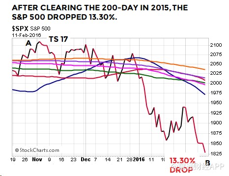 收高于200日均線并非安全信號。2015年,標(biāo)普500指數(shù)連續(xù)8個交易日收于200日上方,但隨后下跌了13.30%:
