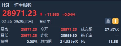 智通財(cái)經(jīng)APP獲悉,恒生指數(shù)開(kāi)盤(pán)漲0.04%%,報(bào)28971.23點(diǎn)。國(guó)企指數(shù)張0.19%,報(bào)11653.15點(diǎn)。紅籌指數(shù)張0.13%,報(bào)4565.49點(diǎn)。大市盤(pán)前成交27.87億港元。隔夜美股小幅收漲,大型科技股集體收漲,港股ADR指數(shù)全日僅微升。
