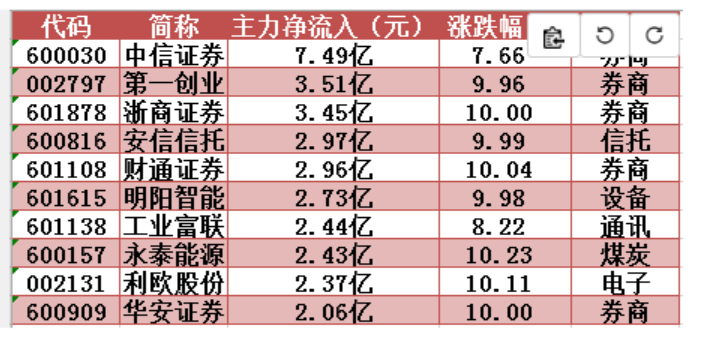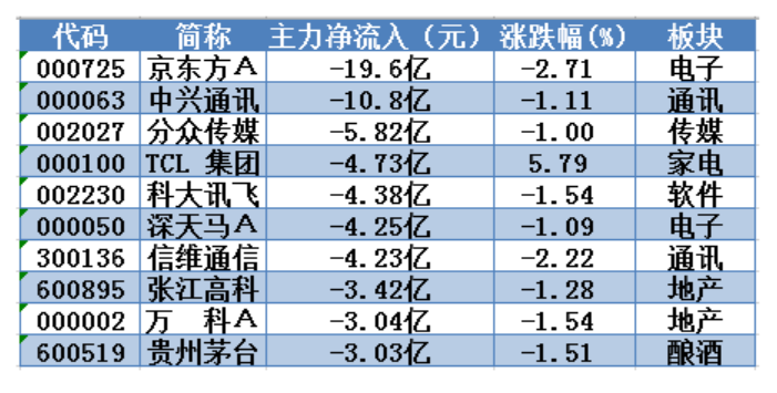 周三兩市主力資金凈流入(出)前10只個股: