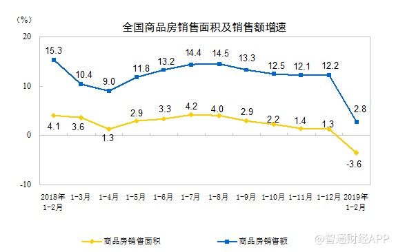 2月末,商品房待售面積52251萬平方米,比2018年末減少162萬平方米。其中,住宅待售面積增加117萬平方米,辦公樓待售面積增加49萬平方米,商業(yè)營業(yè)用房待售面積減少393萬平方米。