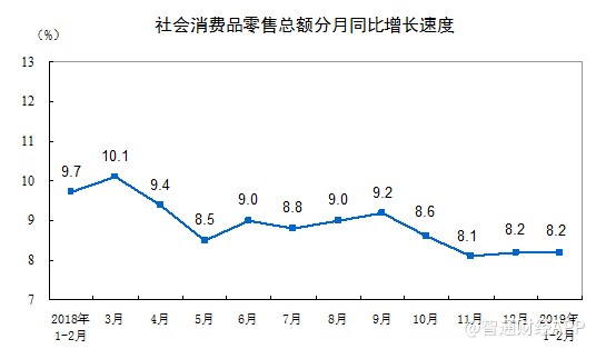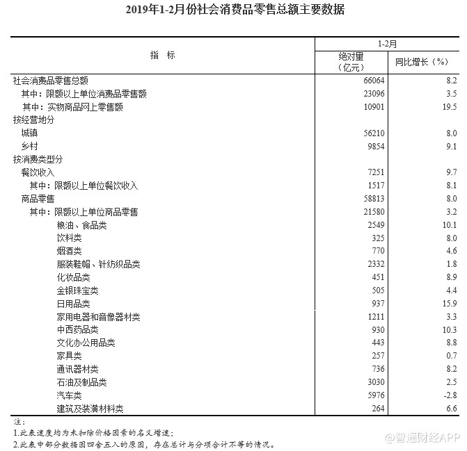 智通財(cái)經(jīng)APP獲悉,國家統(tǒng)計(jì)局公布,2019年1-2月份,社會(huì)消費(fèi)品零售總額66064億元,同比名義增長8.2%,符合預(yù)期,但低于前值增長9%。其中,限額以上單位消費(fèi)品零售額23096億元,增長3.5%。