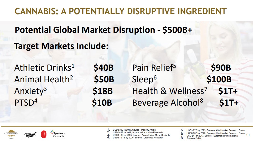 CANOPY GROWTH根據(jù)Allied Market Research Group等調研機構按照不同用途做了一組測算,未來該行業(yè)的將會滲透全球至少5000億美元的市場: