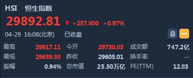智通財經APP獲悉,恒指早盤高開125.84點或0.43%,報29730.85點。截至收盤,恒生指數(shù)漲287.8點或0.97%,報29892.81點,全日成交額達747.22億。國企指數(shù)漲1.11%,報11638.18點,紅籌指數(shù)漲0.83%,報4620.34點。