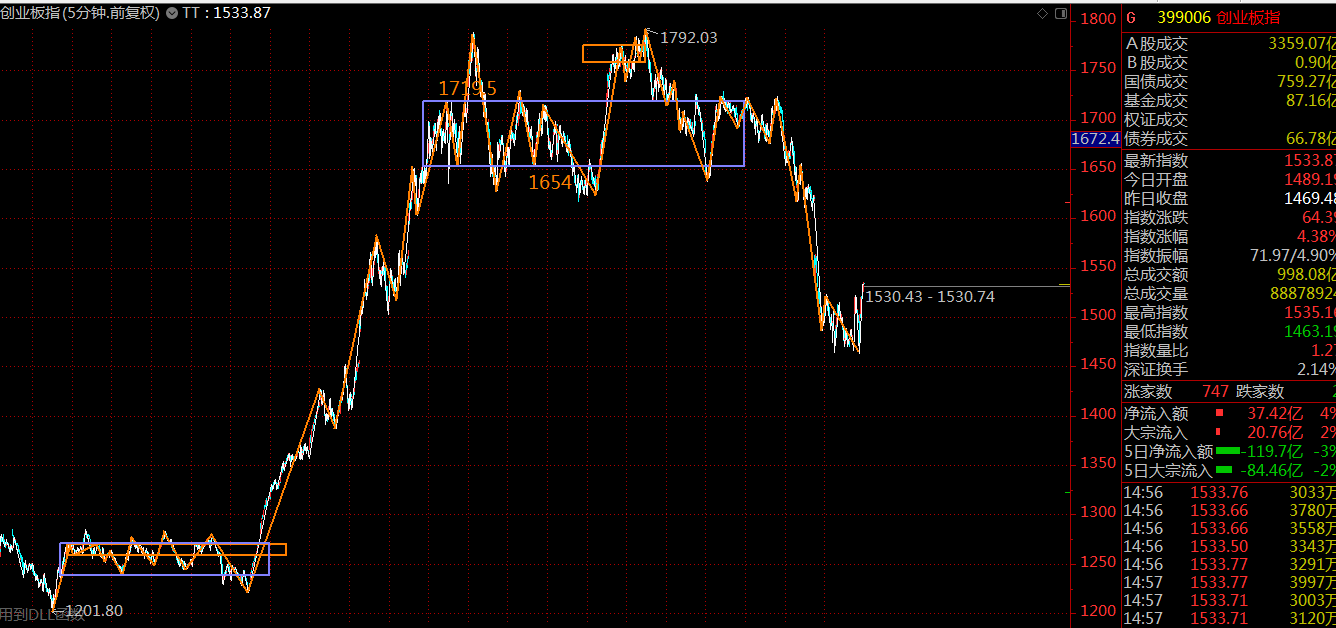 創(chuàng)業(yè)板這里走勢結(jié)構(gòu)粗暴直接的多,目前已遠(yuǎn)離上方的三十分鐘中樞,壓力位在上方中樞下沿1616點附近,空間較大。相對來說,短期小票走勢可能會強一些。