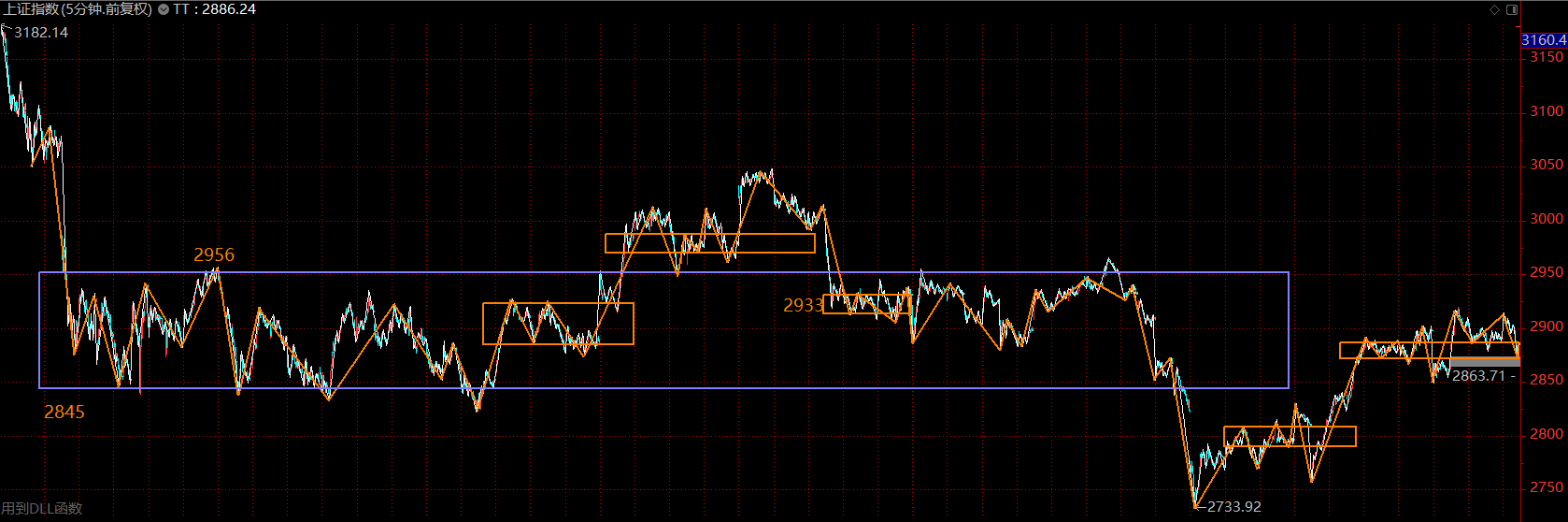 上證指數(shù)上周在這個(gè)位置做中樞擴(kuò)展,將五分鐘上漲的第二個(gè)中樞擴(kuò)展為三十分鐘級(jí)別的。這是強(qiáng)勢(shì)的一種表現(xiàn),市場(chǎng)在震蕩中消化拋壓。這里需關(guān)注大中樞的下軌2845點(diǎn),跌破后,可能會(huì)帶來指數(shù)的二次探底,這將是絕佳的加倉點(diǎn)位,不跌破則市場(chǎng)隨時(shí)會(huì)上攻2950點(diǎn)。目前態(tài)勢(shì)下,應(yīng)以持倉為主。