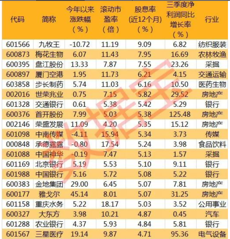 3、高股息率股票貴在穩(wěn)健、安全,長(zhǎng)期看,即使市場(chǎng)出現(xiàn)長(zhǎng)期調(diào)整,高股息個(gè)股也可以給投資者帶來(lái)穩(wěn)定的現(xiàn)金收入;目前高股息率個(gè)股的整體估值較低,根據(jù)以下條件篩選高股息率潛力股:1、滾動(dòng)市盈率小于20倍;2、2016、2017、2018連續(xù)三年股息率大于4%;3、最近12個(gè)月股息率大于4%;4、前三季度凈利潤(rùn)同比增長(zhǎng)。