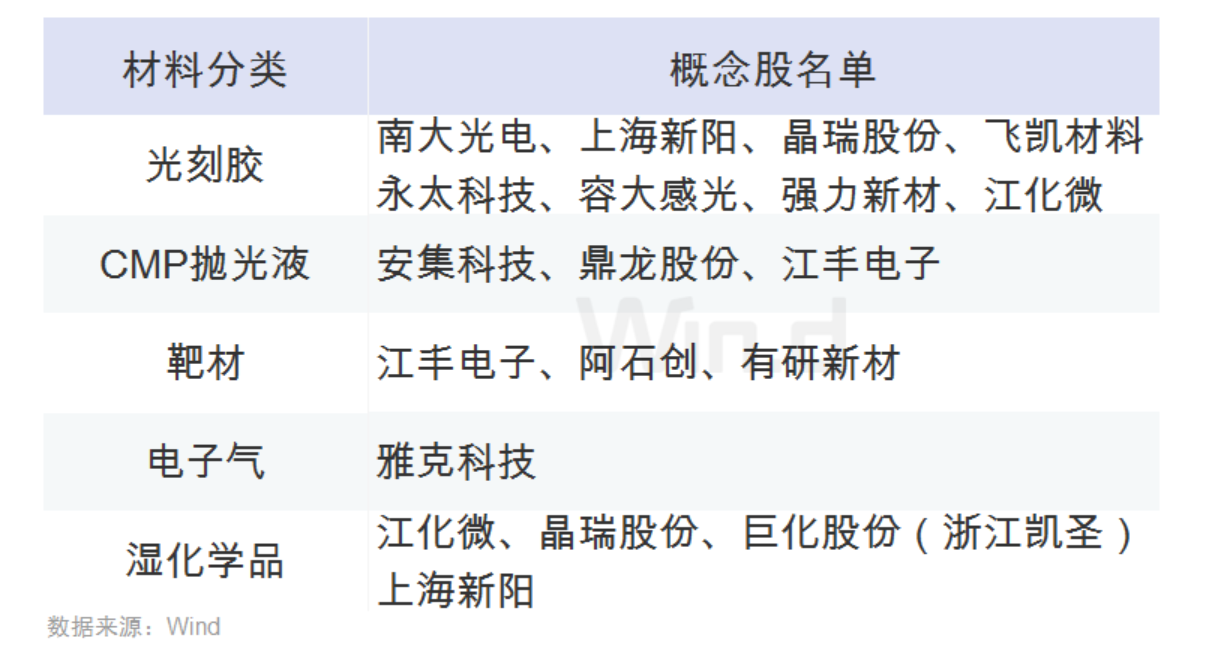 從技術(shù)水平來看,PCB光刻膠是目前國產(chǎn)替代進度最快的。A股公司中,飛凱材料(300398)已經(jīng)在高端的濕膜光刻膠領(lǐng)域通過下游廠商驗證;面板光刻膠進度相對較快,目前永太科技(002326)CF光刻膠已經(jīng)通過華星光電驗證。
