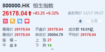 恒生指數(shù)開(kāi)盤漲0.32%,報(bào)26178.04點(diǎn)。國(guó)企指數(shù)漲0.28%,報(bào)10388.22點(diǎn)。紅籌指數(shù)漲0.12%,報(bào)4319.29點(diǎn)。大市盤前成交18.01億港元。