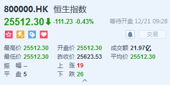 恒生指數(shù)開(kāi)盤跌238.02點(diǎn)或0.92%,報(bào)25515.4點(diǎn)。國(guó)企指數(shù)跌1.1%,報(bào)9990.09點(diǎn)。紅籌指數(shù)跌0.91%,報(bào)4086.09點(diǎn)。大市盤前成交26.82億港元。