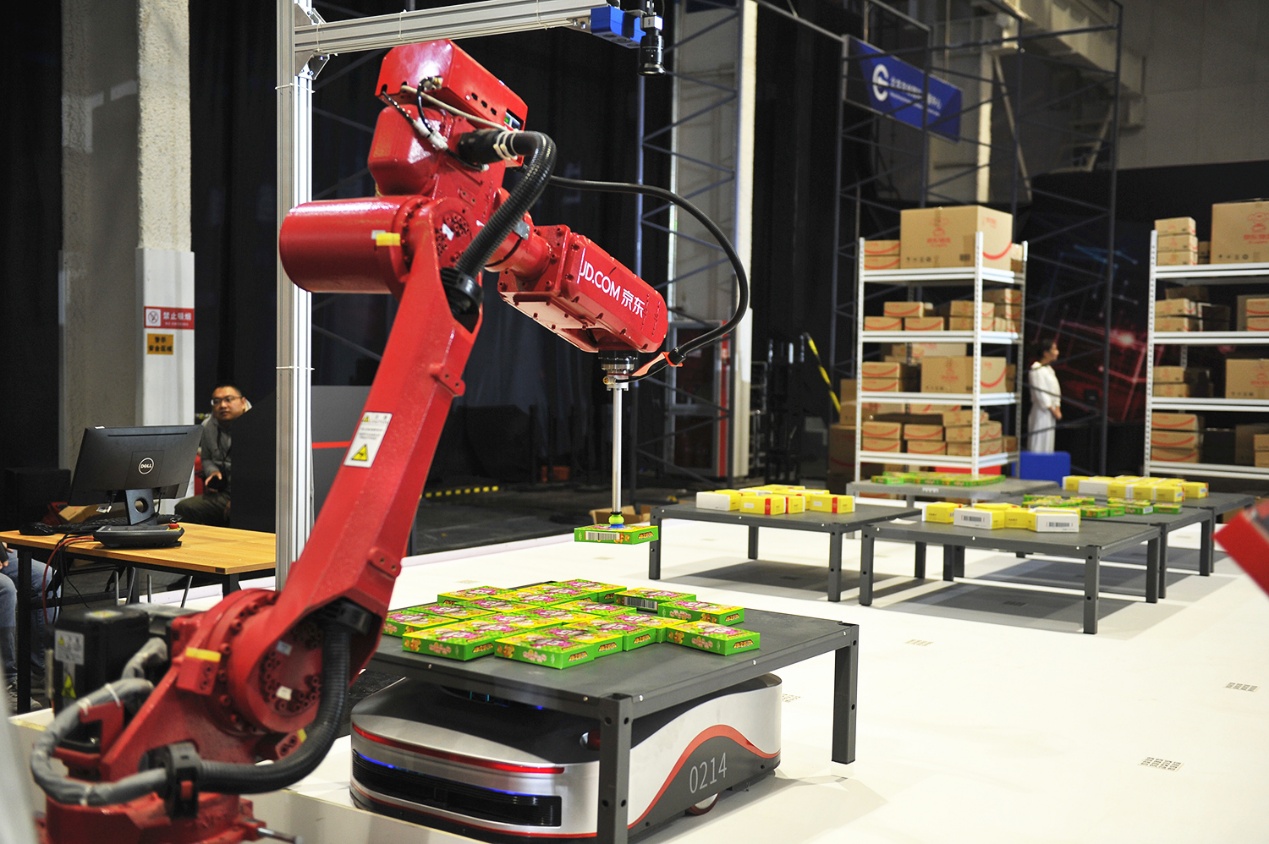 為了展現(xiàn)無人倉的全程智能化流程,本次峰會外展區(qū)設(shè)置了智能動態(tài)展區(qū)。在現(xiàn)場,動態(tài)運(yùn)行的揀選機(jī)械臂、自動打包機(jī)與飛馬機(jī)器人、智能叉車等一起,共同構(gòu)成了京東無人倉強(qiáng)大的倉儲系統(tǒng)。目前在京東智能化倉儲體系內(nèi),智能機(jī)器人設(shè)備已經(jīng)實(shí)現(xiàn)了家用電器、美妝個護(hù)、電腦辦公、服飾內(nèi)衣、醫(yī)療保健等五大訂單品類的應(yīng)用場景覆蓋,通過地狼、天狼、分揀AGV、交叉帶分揀機(jī)、AGV叉車、機(jī)械臂等12種自主研發(fā)機(jī)器人的投用,大大提升了京東的訂單處理效率。