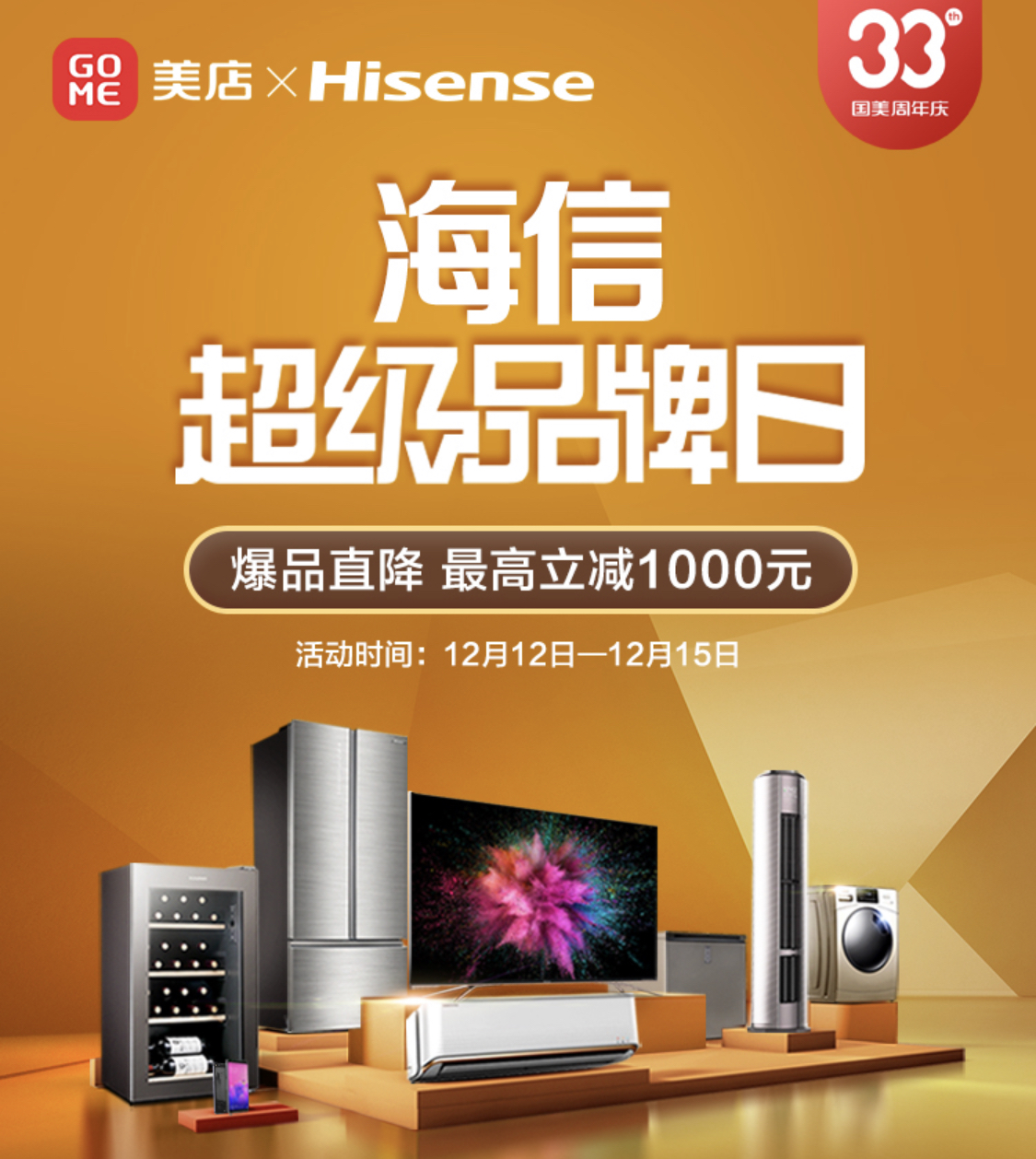 深圳新聞網(wǎng)2019年12月12日訊 12月12日-15日,國美33周年慶活動已經(jīng)啟動,屆時(shí)消費(fèi)者可在深圳國美門店參與“全場好物,第二件5折起”活動。同時(shí),海信、海爾、美的超級品牌日活動也將于12日-15日期間在國美美店展開。用戶在國美APP中美店活動專區(qū)便可參與到活動中來,下面為大家介紹下本次海信超級品牌日的重磅爆品,全場最高立減1000元,還有機(jī)會獲得愛奇藝四端VIP會員卡和小度音箱等福利獎品,不要錯(cuò)過。