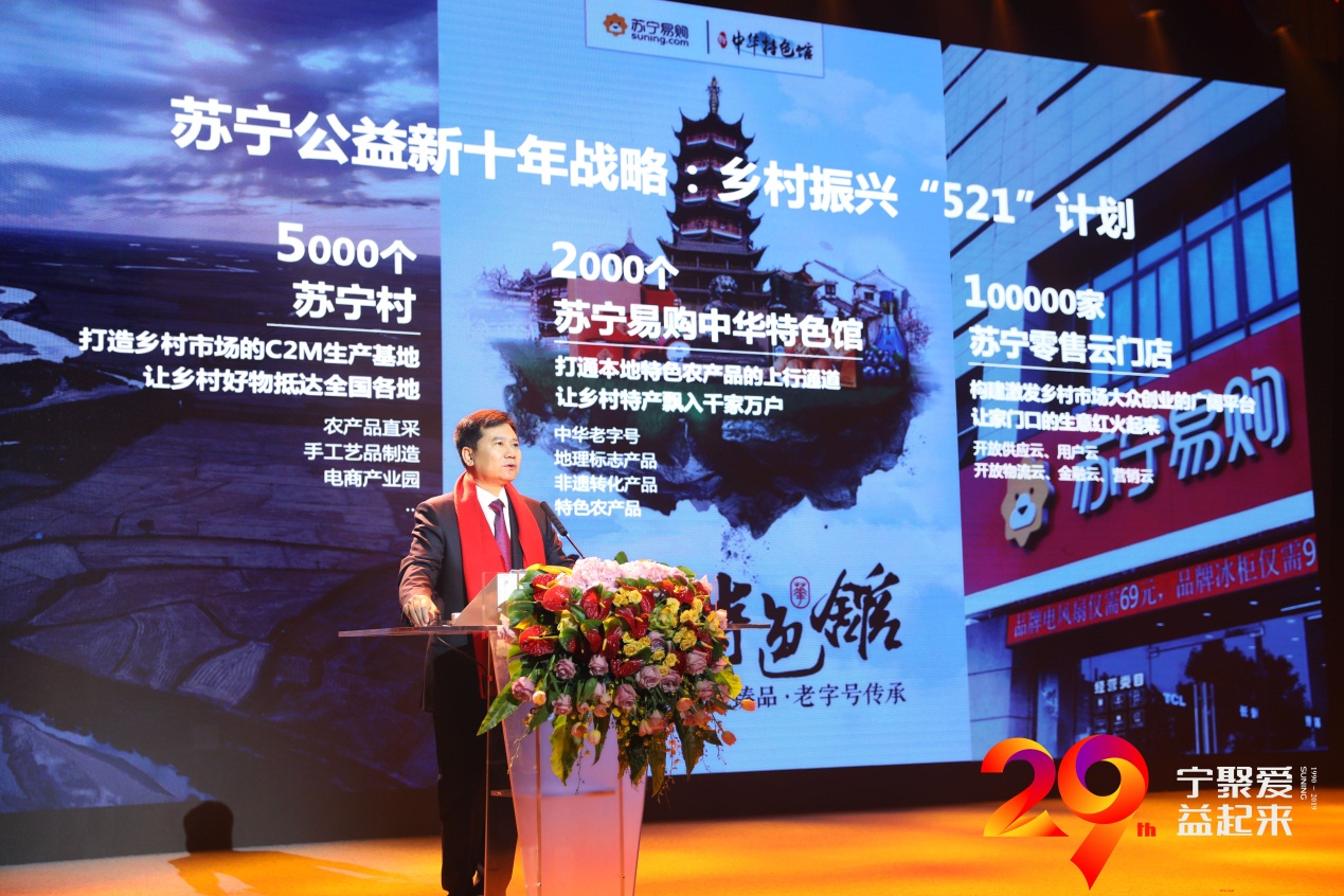 就在12月26日舉行的“蘇寧29周年公益慶生儀式暨新十年公益戰(zhàn)略發(fā)布會(huì)”上,蘇寧控股集團(tuán)董事長(zhǎng)張近東發(fā)布了蘇寧鄉(xiāng)村振興“521計(jì)劃”,中華特色館是其中重要部分,未來(lái)十年要達(dá)到2000個(gè)。同時(shí),蘇寧村將會(huì)建設(shè)至5000個(gè),蘇寧易購(gòu)零售云門店則將要開(kāi)到10萬(wàn)家。張近東表示,“521”取自三個(gè)目標(biāo)的首個(gè)數(shù)字,同時(shí)也寄托著著蘇寧幫扶鄉(xiāng)村、振興鄉(xiāng)村的深切感情。