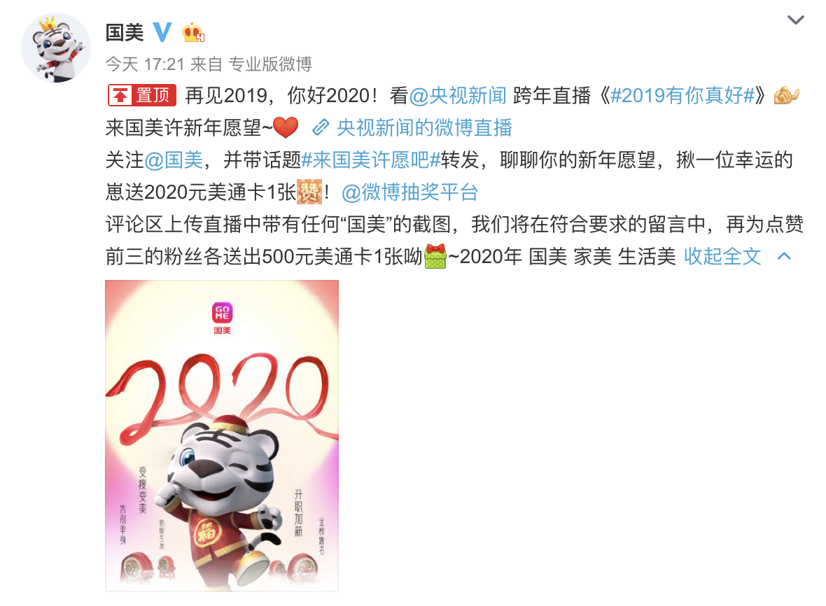 今年是國美首次聯(lián)合央視新聞跨年直播,為實(shí)現(xiàn)廣大國美用戶的心愿,回饋消費(fèi)者。國美還在微博啟動(dòng)多個(gè)有獎(jiǎng)轉(zhuǎn)發(fā)活動(dòng),獎(jiǎng)品為面值200元、500元、2020元的國美美通卡,如果沒有趕上央視新聞的跨年直播,還可在國美官方微博參與抽獎(jiǎng),新的一年有好的開始,沒準(zhǔn)下個(gè)錦鯉就是你!(常軍平)