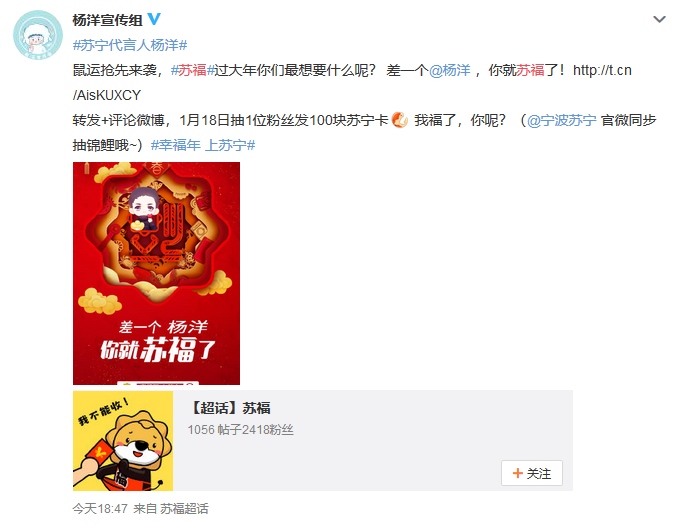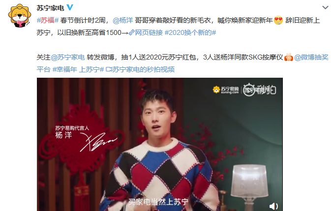 蘇寧代言人楊洋和江疏影也給大家?guī)砹瞬簧俑@劢z們繼續(xù)喊話愛豆,“過年就差一個楊洋了,萬一實現了呢”。蘇寧家電直接開啟鼠運來襲模式,粉絲參與微博互動,就有機會獲得2020元蘇寧紅包,還能獲得楊洋同款SKG按摩儀。