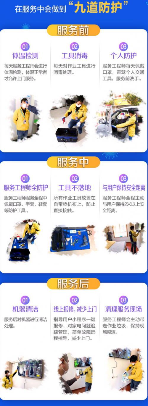 服務體驗一直以來都是家電行業(yè)的重頭戲,現(xiàn)在正處于疫情特殊時期,蘇寧第一時間做出應對之策,為避免人際接觸帶來的潛在感染風險,蘇寧幫客全面升級“安心服務“,發(fā)布九道防護。據(jù)防護細則,蘇寧幫客每名工程師服務前會經(jīng)過體溫檢測、工具消毒、個人防護三道工序,服務中將做到工程師全防護、工具不落地、并與用戶保持安全距離,服務后將對家電進行清潔,并帶走作業(yè)垃圾。據(jù)了解,目前,“九道防護”已經(jīng)全面覆蓋家電、家居、家裝的安裝、維修等方面,蘇寧的面面俱到將守護用戶的健康做到了極致。(吳艷 通訊員黃敏君)