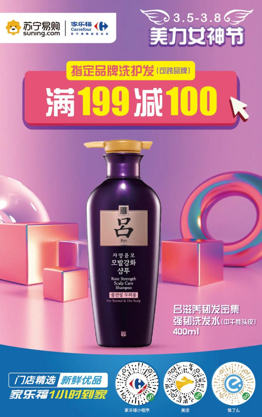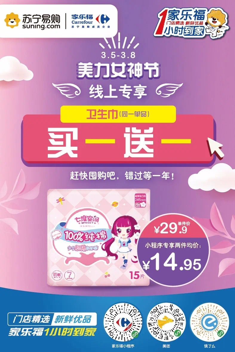 當(dāng)然,家樂福也一直在線,給你們送上儀式感節(jié)日福利。3月5日至3月8日,家樂福美“力”女神節(jié)熱辣來襲。家樂福小程序、蘇寧易購APP、蘇寧小店APP、美團(tuán)外賣和餓么了五大線上平臺“火力全開”,讓你的美麗一直營業(yè)不打烊。