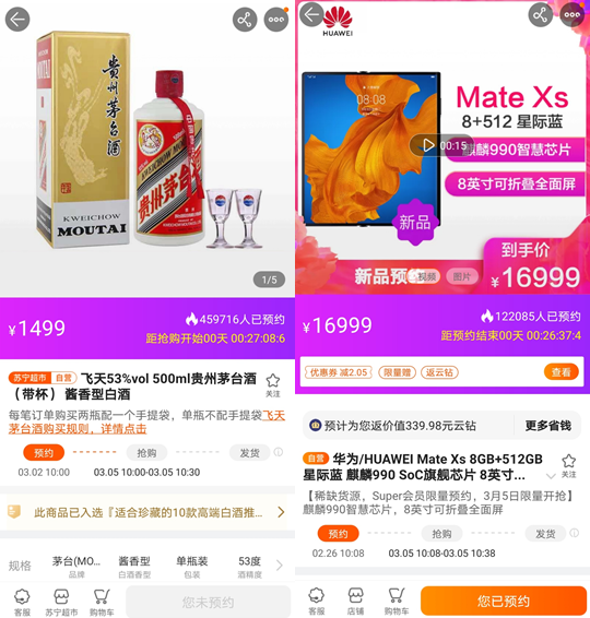 截止到開售前,蘇寧易購平臺飛天茅臺預(yù)約量將近46萬人,華為Mate Xs預(yù)約量超過12萬人,兩款高端產(chǎn)品在蘇寧易購累計預(yù)約人數(shù)達到58萬人,值得注意的是,這兩款在各自領(lǐng)域的頂尖高端產(chǎn)品,蘇寧易購SUPER會員可預(yù)約購買,8分鐘內(nèi)有58萬人瞄準(zhǔn)這兩款產(chǎn)品,并且都是一經(jīng)開售就被快速搶完,左手茅臺右手華為Mate Xs,消費熱情不減。