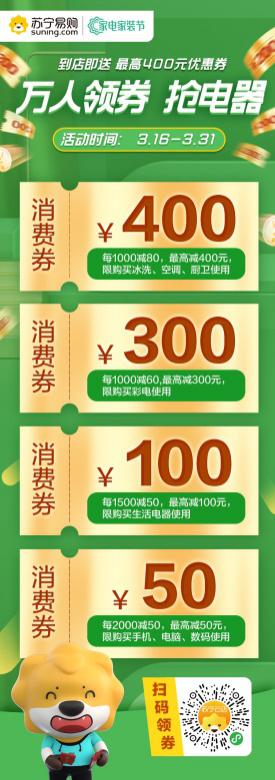 據了解,深圳蘇寧3月16日至3月31日期間放出大招,強勢推出“萬人領券搶電器”活動,攜手空調、廚衛(wèi)、冰洗、彩電、3C數碼和生活電器全品類百大品牌全面發(fā)力,以千萬補貼讓利回饋消費者。針對整個粵東區(qū)域限量投放近20萬張400元、300元、100元、50元不等的家電消費券,在活動前期通過社群、門店、金牌V購等線上線下即可領取,在粵東區(qū)域所有蘇寧門店及V購均可使用。