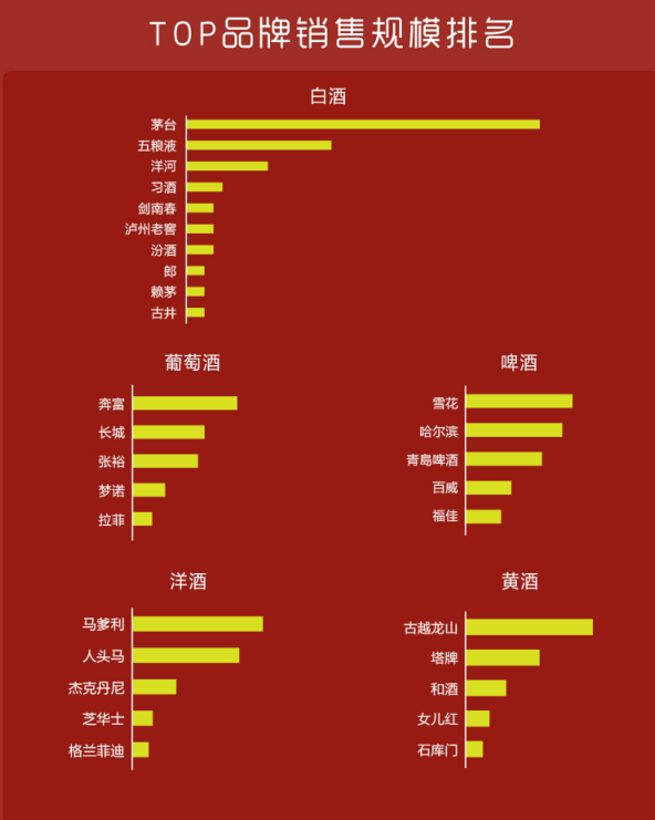具體來(lái)說(shuō),從蘇寧超市公布的品牌銷(xiāo)售規(guī)模排行榜來(lái)看,茅臺(tái)、五糧液、洋河、習(xí)酒、劍南春、瀘州老窖、汾酒、郎酒、賴茅、古井成為當(dāng)之無(wú)愧的白酒品類(lèi)銷(xiāo)售top10品牌。奔富、長(zhǎng)城、張?jiān)?、?mèng)諾、拉菲則成功問(wèn)鼎葡萄酒銷(xiāo)售top5,雪花、哈爾濱、青島、百威、福佳在啤酒品類(lèi)中銷(xiāo)售表現(xiàn)最好。馬爹利、古越龍山則分別成為洋酒、黃酒品類(lèi)銷(xiāo)售冠軍。