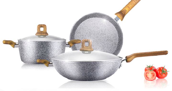 滿足炒、煎、燉多種需求,一套高品質、高顏值的鍋具相信你一定不會拒絕。三禾鍋具三件套 T606是膳石犀利花崗巖健康不粘鍋,采用花崗巖納米起點,不粘更持久,耐磨性更高,堪稱品質首選。除此之外,其還擁有五層技術工藝,并采用一體成型設計,質量顏值雙升級。原木紋手柄,防霉防燙;鋼化玻璃蓋,密封防溢;節(jié)能復合底受熱均勻。三件套內包含炒鍋、煎鍋、燉鍋。