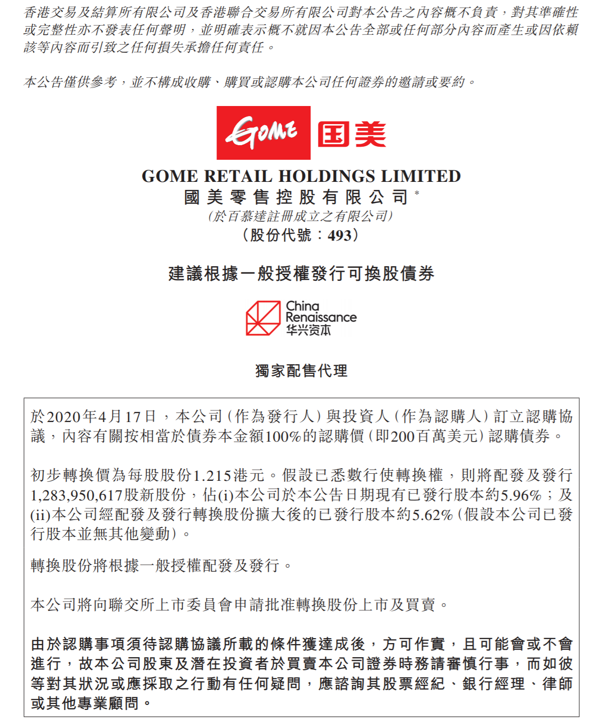 公告稱,拼多多以總計(jì)2億美金的可轉(zhuǎn)換債券方式對國美進(jìn)行戰(zhàn)略投資。根據(jù)協(xié)議,初步股份轉(zhuǎn)換價為每股1.215港元,分別較國美零售2020年4月17日收盤價及截至2020年4月16日前五個連續(xù)交易日之平均收盤價溢價66.44%及68.75%。