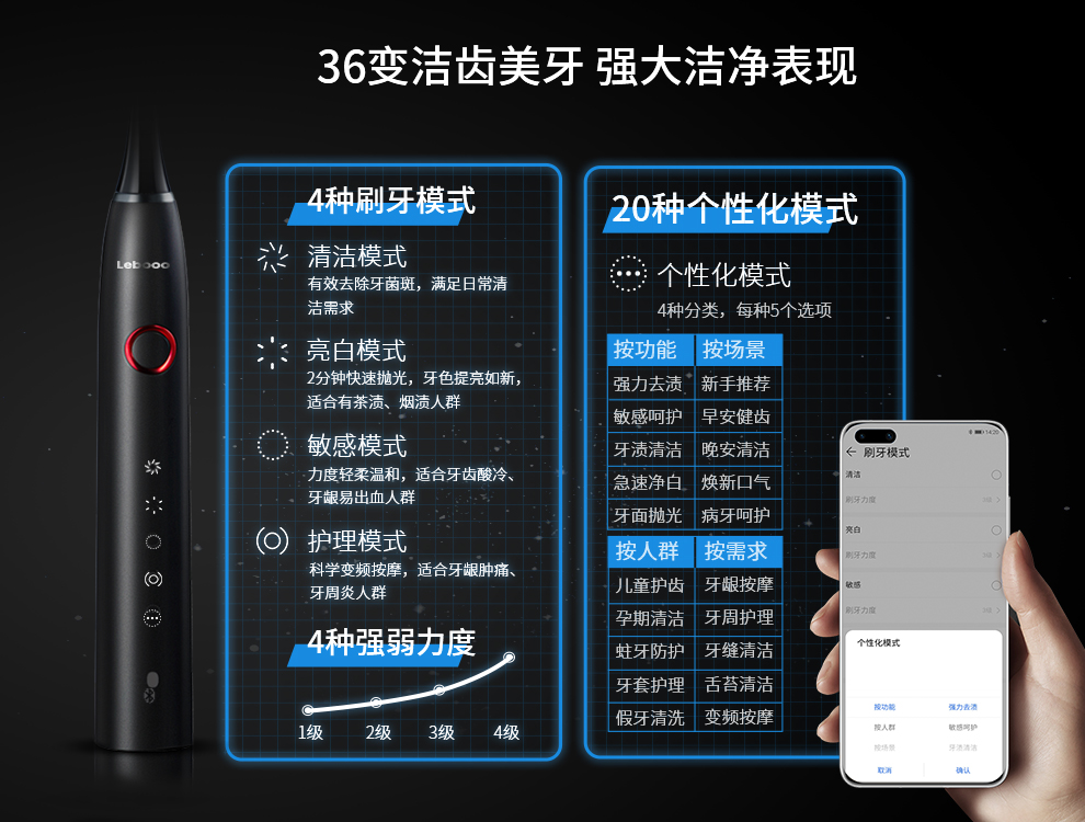值得一提的是,力博得智能聲波牙刷·星鉆內(nèi)置壓力傳感系統(tǒng),具有36種潔齒檔位,4種潔齒模式和4級(jí)力度調(diào)節(jié)。強(qiáng)勁清潔模式:滿足日常清潔需求;拋光亮白模式:適合追求亮白人士;溫和敏感模式:適合牙齦易出血人群;輕柔護(hù)理模式:為牙病問題而生,體貼入微。以上模式各有1-4級(jí)力度調(diào)節(jié),更加人性化。