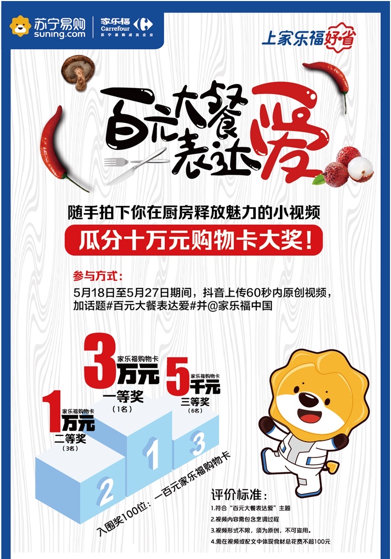 近期陳老伯和女兒聊的最多的除了做菜,還有父女倆都很期待的一場比賽。據(jù)悉,5月18日至6月18日,家樂福將舉辦一場主題為“百元大餐表達愛”的鄰家大廚視頻PK賽,鼓勵參賽者做道有故事的菜,向摯愛的人表達濃濃的情意。你負(fù)責(zé)做菜,家樂福負(fù)責(zé)買單。你無需具備可媲美專業(yè)廚師的高超技藝,僅需擁有一顆熱愛美食的心和一雙巧手,無論是國人經(jīng)典標(biāo)配的“四菜一湯”,抑或是最適合情侶的西式浪漫—牛扒配紅酒,隨你發(fā)揮。以百元預(yù)算準(zhǔn)備食材,將烹調(diào)過程上傳抖音。屆時,突圍選手將有機會瓜分價值十萬元的購物卡大獎。