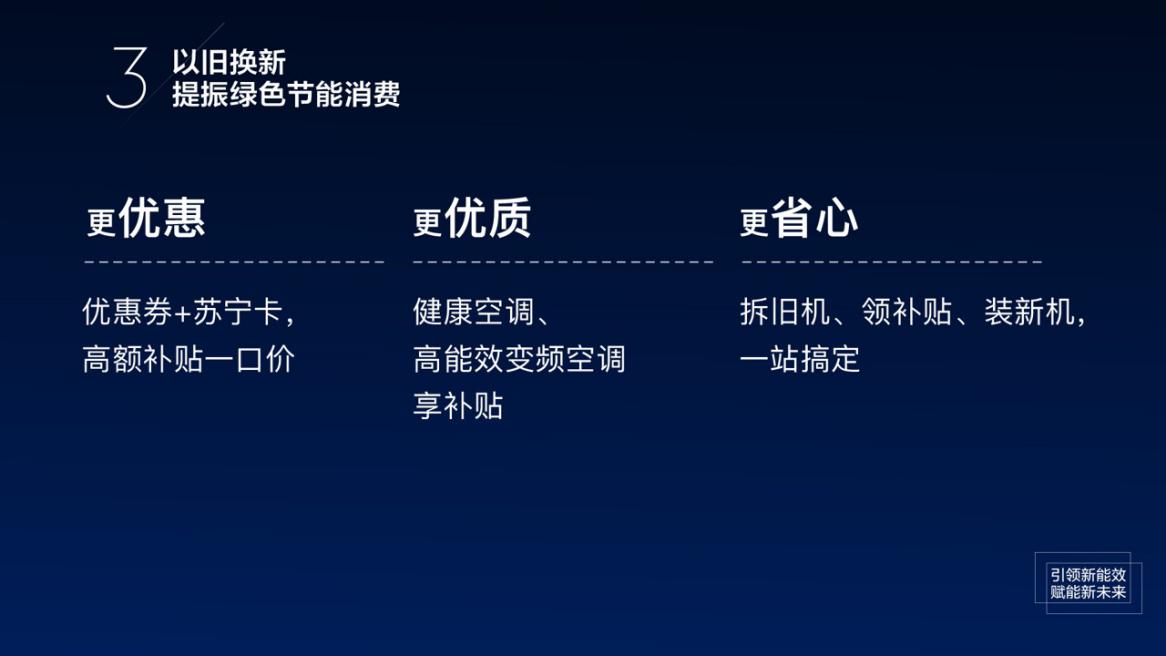 實(shí)現(xiàn)能效、健康升級,以舊換新是“剛需”。2020年,蘇寧空調(diào)重磅加碼以舊換新,舊機(jī)估值一口價(jià),換新時(shí)購買高能效變頻產(chǎn)品與健康空調(diào)可享高額補(bǔ)貼,同時(shí)為解決流程繁瑣問題,將持續(xù)優(yōu)化拆舊機(jī)、領(lǐng)補(bǔ)貼、裝新機(jī)的一站式服務(wù),真正實(shí)現(xiàn)更優(yōu)惠、更優(yōu)質(zhì)、更省心。