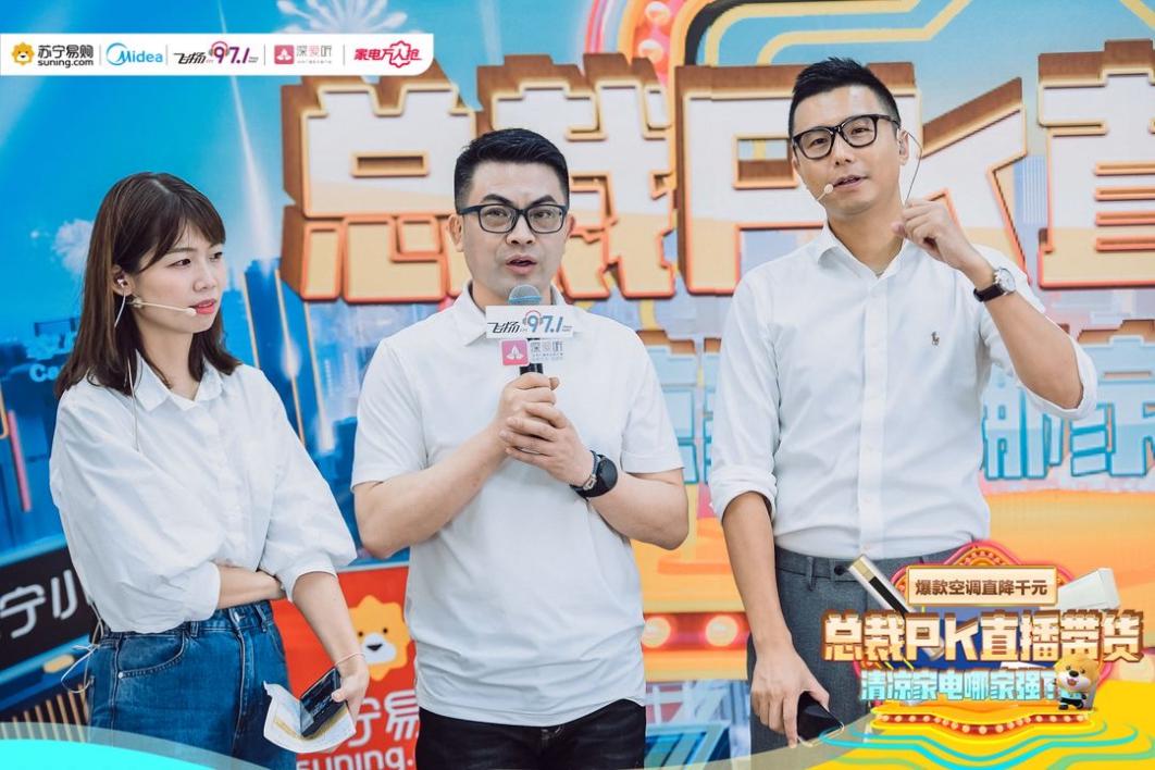 下午五點到六點,繼上場總裁PK直播后,深圳蘇寧聯(lián)合美的攜手飛揚97.1廣播電臺主播持續(xù)再開展一場趣味電臺直播,開播期間觸達近500萬粉絲,其中999元爆款空調(diào)以及美的國米定制版空調(diào)在開播僅30分鐘就被搶購一空,在總裁們的不斷加碼中,整個直播過程中滿足超過2000名顧客的購物需求。