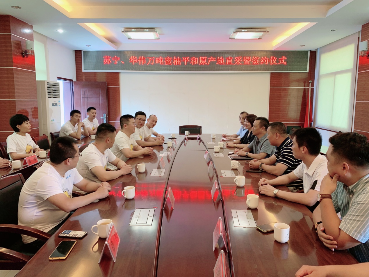 8月26日,蘇寧家樂福中國區(qū)生鮮采購總監(jiān)孫樂超、水果組總監(jiān)孟碩、華南區(qū)采購總監(jiān)周益明,以及蘇寧易購水果組采銷總監(jiān)戴躍等一行來到位于福建省平和縣的華偉農(nóng)業(yè)蜜柚基地,與平和縣委書記郭德志等地方領(lǐng)導(dǎo)共同宣布蘇寧家樂福&華偉農(nóng)業(yè)蜜柚直采基地的正式啟動。