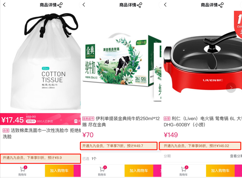 其中,原價19.9元的潔致綿柔洗臉巾只需8.9元即可到手,會員用戶在享受會員日常價基礎上,疊加享受5.1折;伊利金典純牛奶原價70元,九九會員可享受7.1折,49.7元就能到手;原價149元的利仁電火鍋,九九會員可享受9.8折,到手價146.02元。此外,部分小家電產(chǎn)品還可領取滿500減50、滿800減80等滿減優(yōu)惠券,享受折上折。