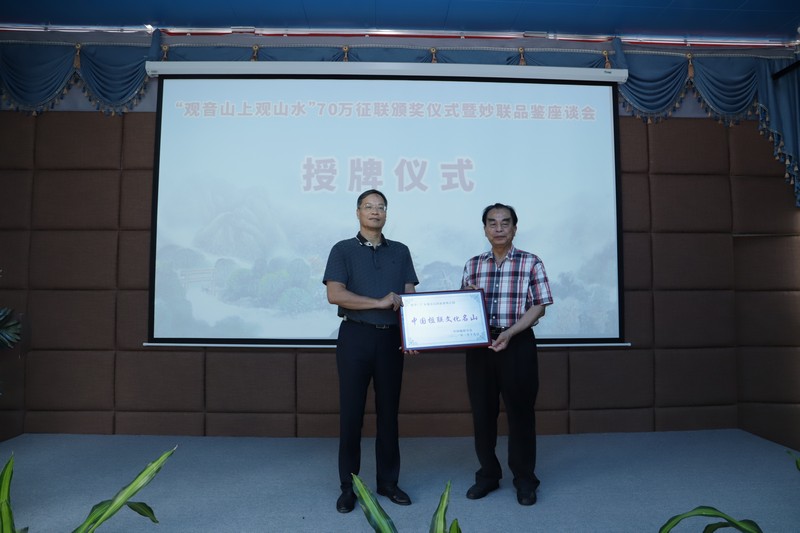 經(jīng)廣東楹聯(lián)學(xué)會(huì)研究決定,授予廣東觀音山國家森林公園“廣東省楹聯(lián)文化示范山”榮譽(yù)稱號(hào),并在活動(dòng)現(xiàn)場(chǎng)進(jìn)行授牌。中國楹聯(lián)學(xué)會(huì)會(huì)長助理、廣東楹聯(lián)學(xué)會(huì)會(huì)長曾建國代表廣東楹聯(lián)學(xué)會(huì),進(jìn)行授牌。