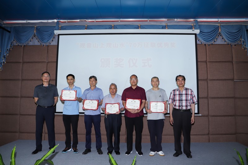 頒獎(jiǎng)儀式現(xiàn)場(chǎng),來自江西、河北的獲獎(jiǎng)代表不遠(yuǎn)千里趕來領(lǐng)獎(jiǎng),中國楹聯(lián)學(xué)會(huì)顧委副主任、中國楹聯(lián)學(xué)會(huì)原副會(huì)長、中國楹聯(lián)界最高獎(jiǎng)項(xiàng)“梁章鉅獎(jiǎng)”獲得者、本次征聯(lián)組委會(huì)主任鄒繼海,與廣東觀音山國家森林公園董事長黃淦波共同給獲得優(yōu)秀獎(jiǎng)代表頒獎(jiǎng)。