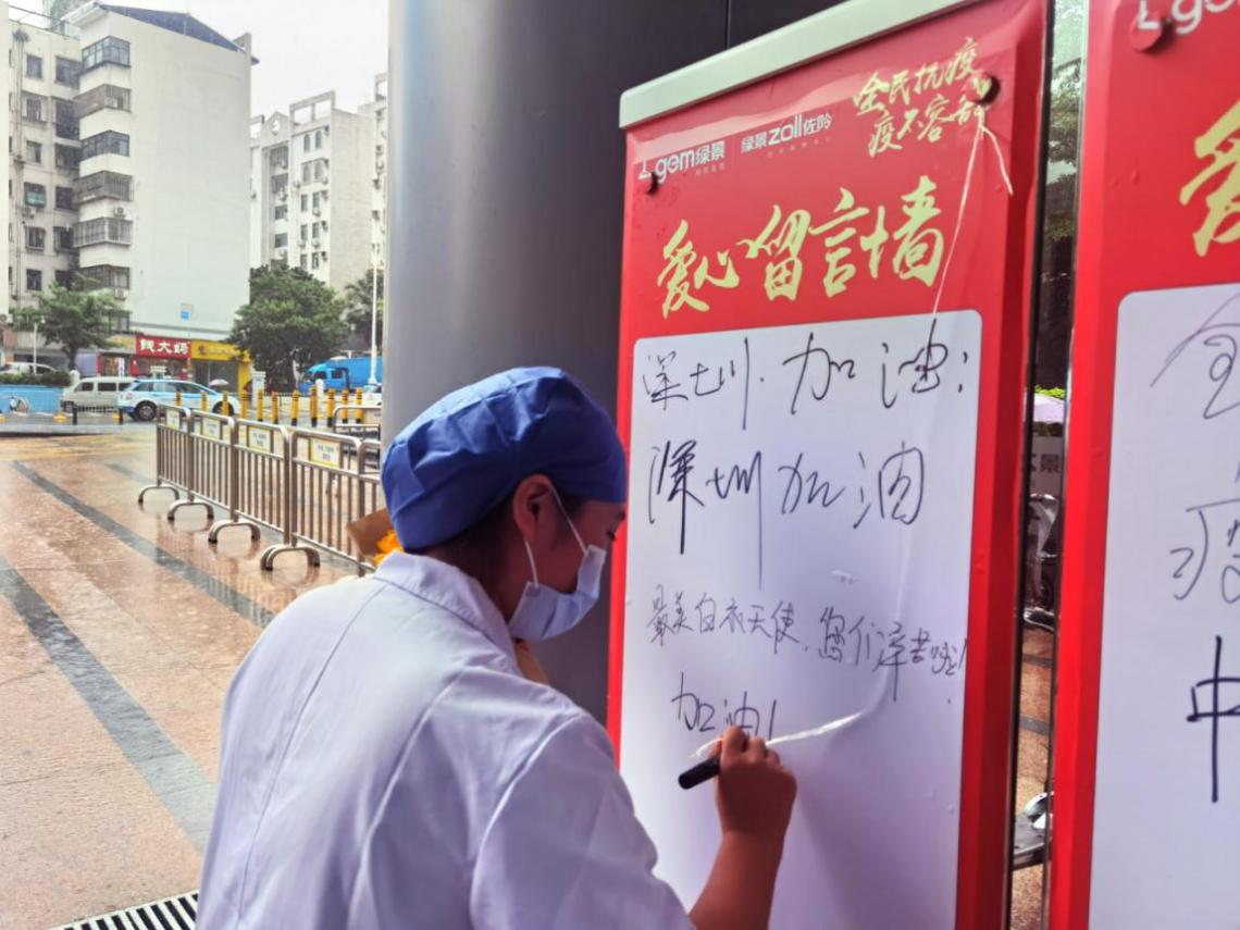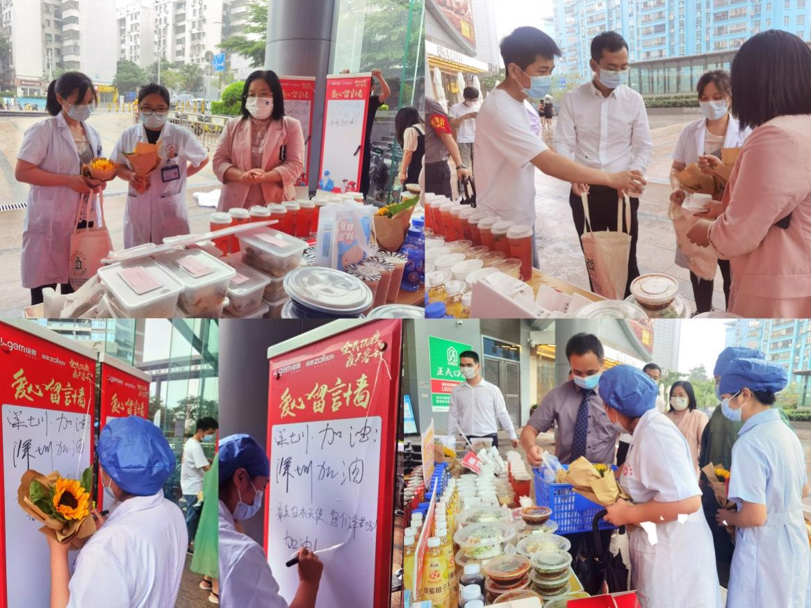 下梅林社區(qū)健康服務(wù)中心的護(hù)士小姐姐們,也在中午換崗的間隙,來到了活動現(xiàn)場挑選美食。護(hù)士小姐姐們非常高興地表示,在暴雨天不用等外賣,就可以享受暖心的美味午餐,可以留出更多的時間,回到崗位工作,繼續(xù)“戰(zhàn)疫”!其中還有一位可愛的護(hù)士小姐姐為給自己加油打氣,在愛心留言墻上,寫下了“加油!我們是最棒的!”