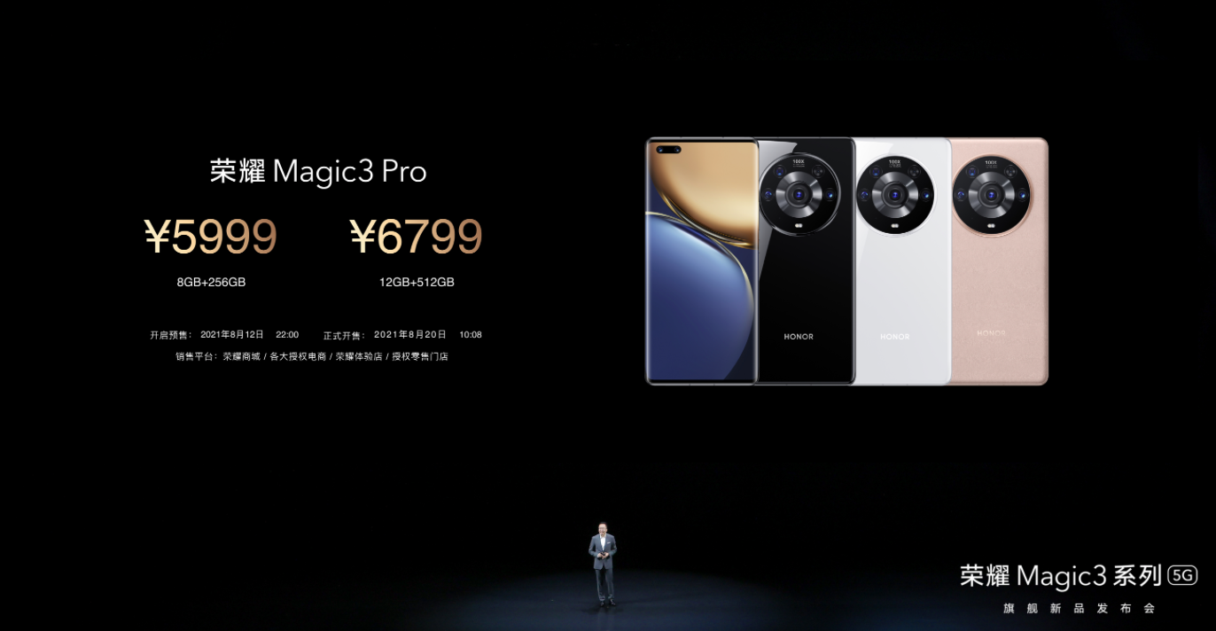 榮耀 M agic38GB+128GB版售價4599元,8GB+256GB版售價4999元;榮耀Magic3 Pro8GB+256GB版售價5999元,12GB+512GB版售價6799元;榮耀Magic3至臻版12GB+512GB售價7999元。8月12日22:00榮耀 Magic3系列手機正式開啟預(yù)售,8月20日10點08分,榮耀 M agic3系列手機將于榮耀商城、各大授權(quán)電商、榮耀體驗店、榮耀零售門店等全平臺開售。
