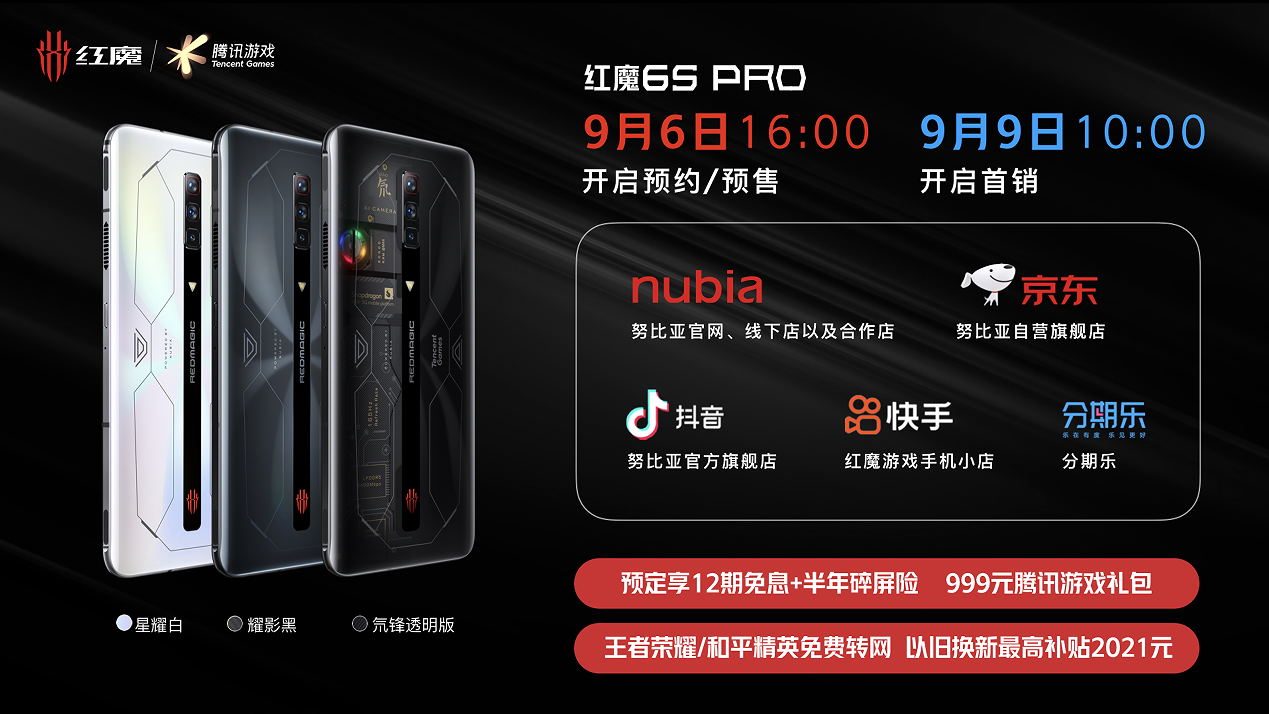 紅魔6S Pro目前已在努比亞官網(wǎng),努比亞京東自營(yíng)旗艦店開(kāi)啟預(yù)售,9月9日上午10點(diǎn)全國(guó)線上線下渠道同步開(kāi)售!現(xiàn)在預(yù)定享12期免息并贈(zèng)送半年碎屏險(xiǎn),購(gòu)機(jī)尊享價(jià)值999元的騰訊游戲禮包、王者榮耀/和平精英免費(fèi)轉(zhuǎn)網(wǎng)資格,以舊換新最高補(bǔ)貼2021元。