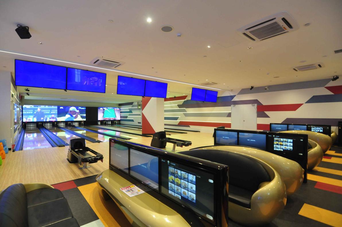 保齡球區(qū)域,朗玩的保齡球采用了美國(guó)Brunswick公司最新的保齡球機(jī)。在放置保齡球瓶的上方墻面上,設(shè)置了放映各種運(yùn)動(dòng)、音樂(lè)節(jié)目的大屏幕。四周設(shè)有的攝像鏡頭能夠全方位捕捉玩家們投球瞬間,在大屏幕上可以看到這些精彩瞬間。采用了鐳射光線等技術(shù)的華麗活動(dòng)(月光投球游戲)每小時(shí)都會(huì)進(jìn)行一次,閃耀炫酷的設(shè)計(jì)會(huì)顛覆玩家們一直以來(lái)對(duì)于保齡球的認(rèn)知!