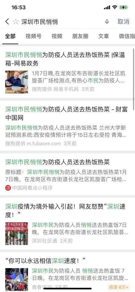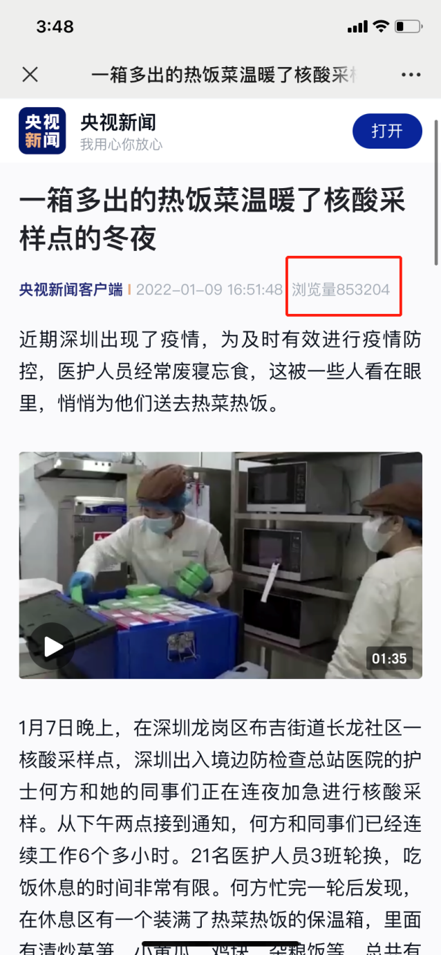 1月9日,一篇名為《一箱多出的熱飯菜溫暖了核酸采樣點(diǎn)的冬夜》的報(bào)道登上了央視新聞。在深圳全民抗疫期間,“維小飯”為核酸檢測醫(yī)護(hù)人員偷偷送上用保溫箱裝好的熱飯熱菜,獲網(wǎng)友紛紛點(diǎn)贊:你永遠(yuǎn)可以相信“深圳速度”,也永遠(yuǎn)可以相信“深圳創(chuàng)新”。央視新聞報(bào)道之后,熱度持續(xù)不減。“深廣電第一現(xiàn)場”“羊城晚報(bào)”“光明網(wǎng)”“中國青年網(wǎng)”等權(quán)威媒體也將此事件進(jìn)行了報(bào)道,引發(fā)眾網(wǎng)友熱議。