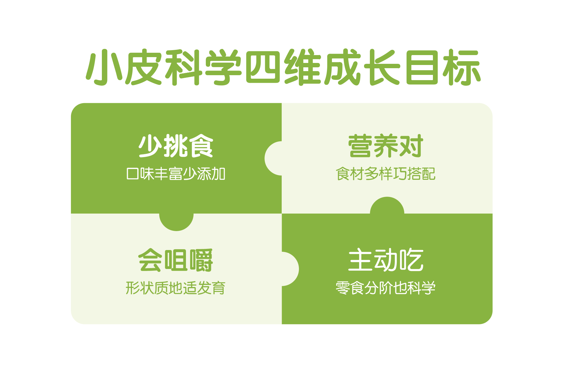 2017年,我國(guó)將“生命早期1000天營(yíng)養(yǎng)健康行動(dòng)”列為國(guó)民營(yíng)養(yǎng)計(jì)劃重大行動(dòng)之一,但相比孕產(chǎn)期與新生兒階段已覆蓋完善的營(yíng)養(yǎng)指導(dǎo)來(lái)說(shuō),輔食階段的科學(xué)喂養(yǎng)關(guān)注程度與認(rèn)知教育還有待提升。在此背景下,小皮基于嚴(yán)謹(jǐn)?shù)目茖W(xué)研究提出《6-36月齡嬰幼兒四維科學(xué)喂養(yǎng)方案》,并通過(guò)中國(guó)食品科學(xué)技術(shù)學(xué)會(huì)權(quán)威論證,旨在幫助寶寶建立起“少挑食、營(yíng)養(yǎng)對(duì)、會(huì)咀嚼、主動(dòng)吃”的健康飲食習(xí)慣。