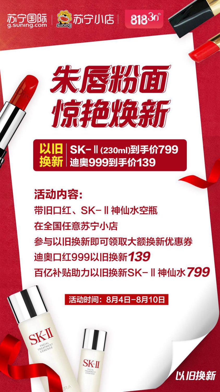 消費者可以帶家中不用的舊口紅、神仙水空瓶在全國任意蘇寧小店,參與以舊換新活動,即可領(lǐng)取大額優(yōu)惠券,用于購買新口紅和神仙水。